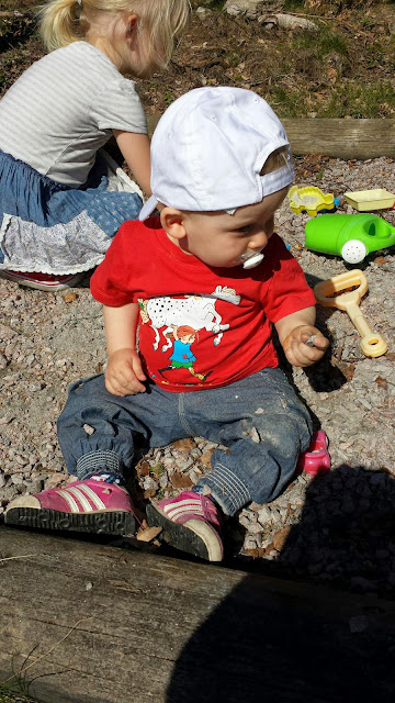 Gabriel är mycket bättre och feberfri idag. Vi tog vagnen och promenerade till förskolan och hämtade Emmy och mötte sedan upp mamma och gick till lekplatsen. Fick även god fika ute i solen hos Mona och Arent.
